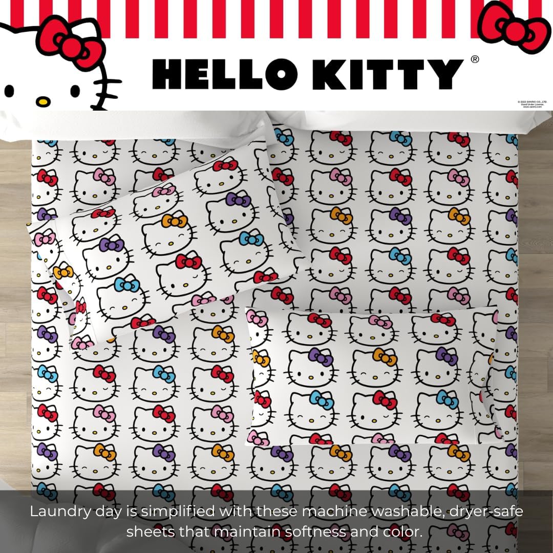 Indulge in the enchanting world of Hello Kitty with our delightful Sheet Set, crafted from luxuriously soft microfiber for a cloud-like embrace each night. This high-quality material enhances your sleep experience, ensuring comfort and durability for years to come. Designed to captivate the hearts of fans young and old, this charming set features various colorful Hello Kitty faces on both the flat and fitted sheets, instantly infusing your sleep sanctuary with delightful cheer. The softness of microfiber enhances the overall coziness, inviting you to snuggle up and unwind in style. The star of the show is the pillowcase, adorned with Hello Kitty's iconic face, bringing sweet innocence and charm to your bedding. This set is perfect for adding a touch of whimsy and joy to any bedroom or nursery. Available in a 3-piece twin size or a 4-piece full size, our Hello Kitty Sheet Set blends cuteness and comfort, making bedtime a joyful and serene experience. Bring the magic of Hello Kitty home today and let your dreams take flight amidst the company of this beloved character.