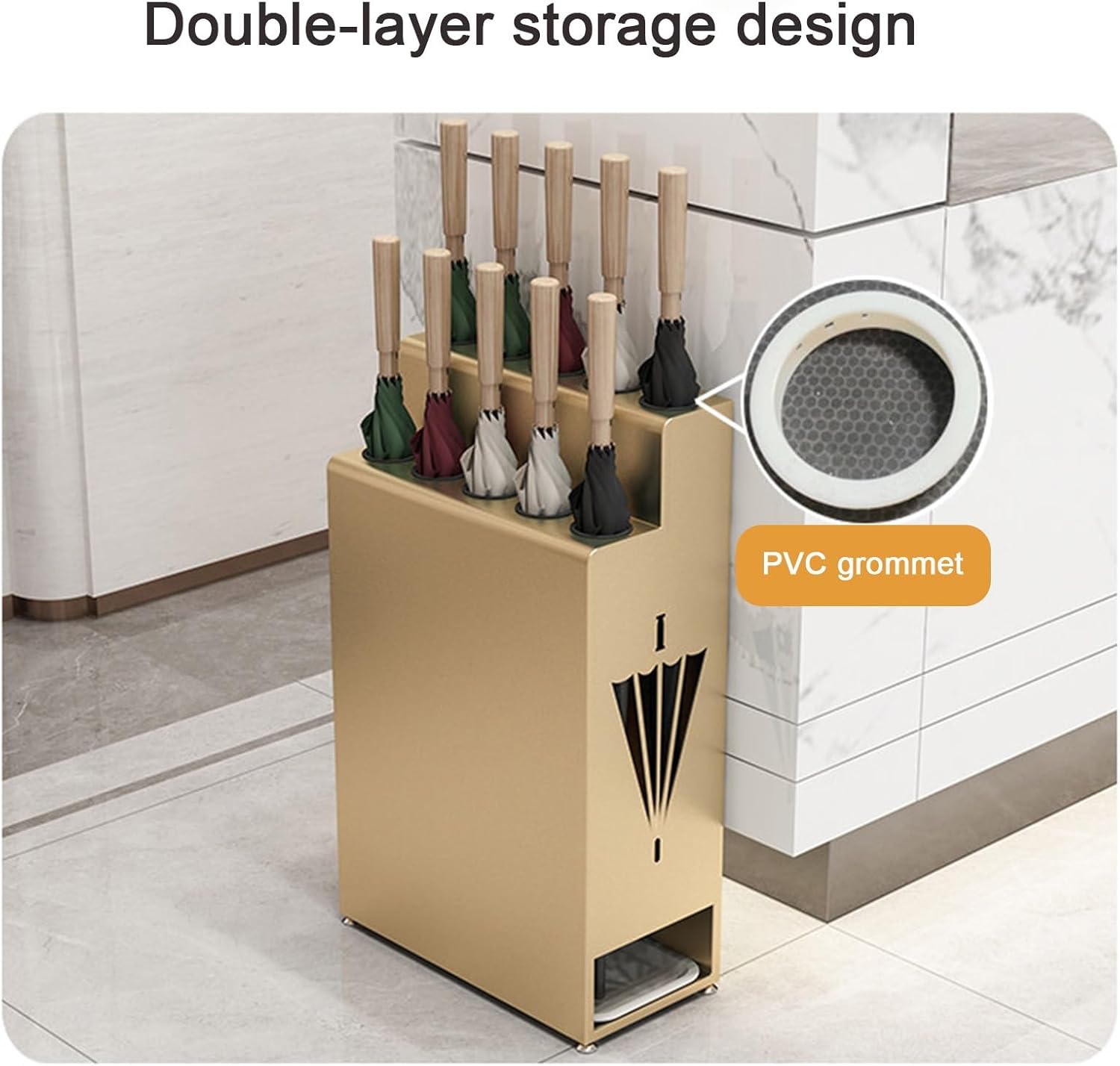 umbrella stand,Introducing our spacious commercial , expertly designed for high-traffic environments like hotel lobbies and corporate foyers. Its sleek and simple design seamlessly fits into various settings, including offices and shopping centers, making it a versatile choice for any establishment. **Product Advantages:** 1. **Removable Tray:** Our features an integrated removable tray that helps prevent puddles and slips on the floor, ensuring a dry and tidy environment for your guests. 2. **Durable Metal Construction:** Crafted from high-quality metal, this is built to withstand the frequent use in busy commercial spaces, ensuring long-lasting performance in hotels and office lobbies. 3. **Elegant Design:** The stylish lattice pattern promotes airflow for faster drying, while adjustable feet provide stability on uneven surfaces, making it both functional and aesthetically pleasing. 4. **Efficient Storage:** With its two-tier storage design, this organizes multiple umbrellas efficiently, accommodating peak rainy seasons or busy visitor periods with ease. **Specifications:** - **Product Name:** - **Dimensions:** 60x40x20 cm (23.62x15.75x7.87 inches) - **Material:** Iron - **Color Options:** Black/White/Gold/Silver **Package Includes:** 1 **Note:** 1. Only the is included; other items are for display purposes only. 2. Please allow a 1-3 cm measurement difference due to manual measurement. 3. Color variations may occur due to different photography tools. Elevate your establishment's entrance with this stylish and functional , designed to enhance your space while providing practical solutions for your guests.