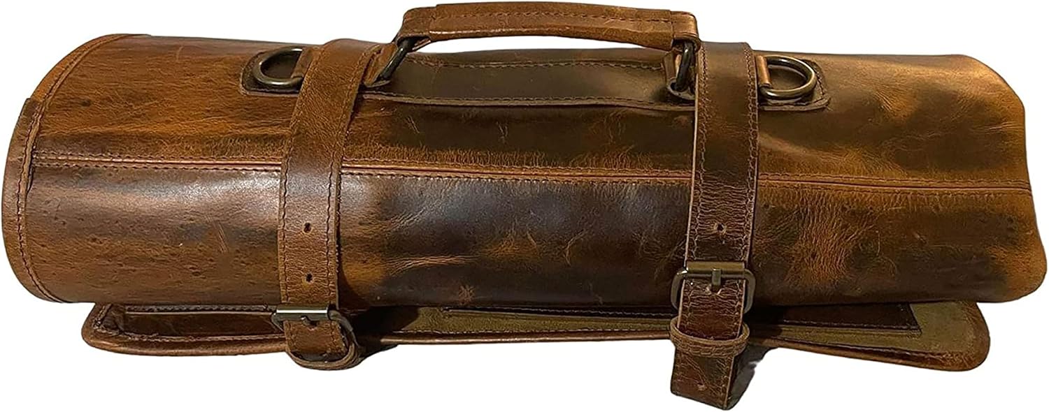 Premium Knife Roll ---- Handcrafted functional art. This genuine leather knife roll bag was designed with durability and style in mind. You'll get many years of use as each is crafted from real leather for the professional kitchen. Supple, strong, easily transported. Offers a quality and attractive solution - no need to compromise. Your knives will be protected on all sides by the thick natural hide. Large size holds knives of various sizes as well as utensils. Knives are not included. 14 Pockets ---- The large size chef knife roll has 14 pockets to secure many types and sizes of knives. The attractive case has 3 additional smaller pockets for utensils and usb drives as well as a larger zip pocket for valuables. It comes included with a matching genuine leather carrying strap. We only use quality hardware in our knife bags. The SharpStyle roll has all the space and pockets you need in a dependable compact package. Protects and Travels ---- No more nics or marring when transporting tools of the trade. The knife bag cradles each blade while securing the handles firmly in place. The carrying case provides a stylish way to transport quality knives - perfect for backyard BBQ, culinary student or professional chef. Rugged and Attractive ---- Our leather knife bag provides the protection you need and is beautifully crafted. The case is designed for functionality and gets more appealing as it ages. It is designed to produce years of durable protection while retaining its appeal. We designed our knife bag to be dependable and strong. Each is a unique creation with it's own looks and personality.