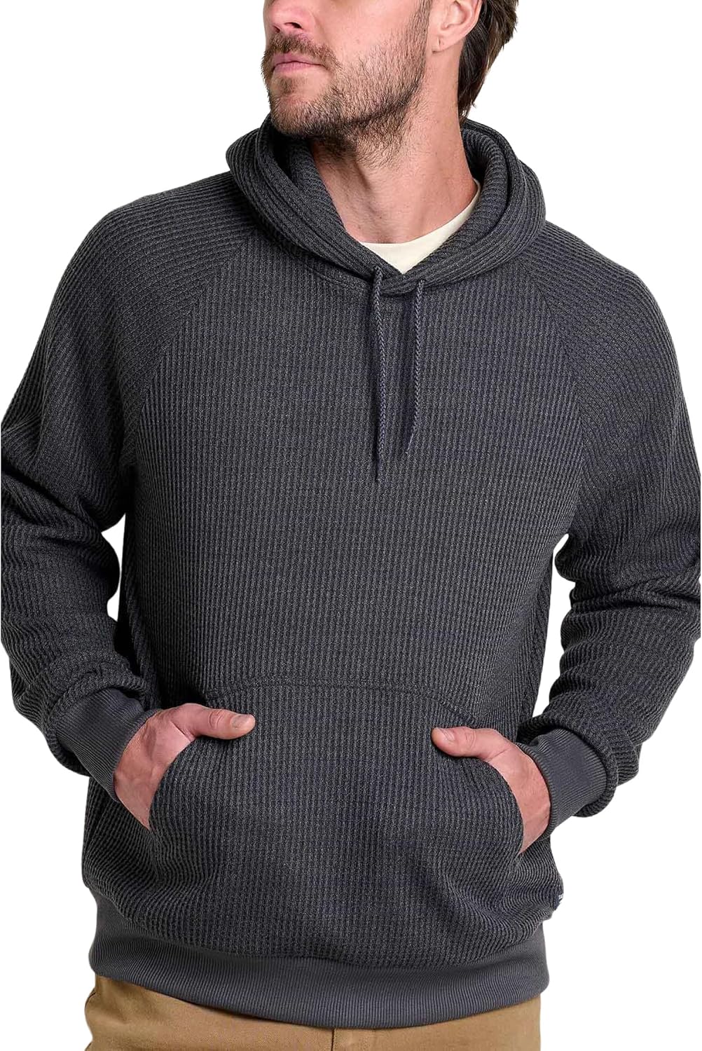 Introducing the Toad&Co Bitterroot Long Sleeve Hoodie, the perfect blend of style and comfort. We like to call this one the Hoodie Plus: All day wearability PLUS won't bag or sag between washes. Midweight waffle knit PLUS Mother Earth friendly recycled polyester. Made from a medium weight waffle fabric with a soft, brushed back, this heritage-inspired hoodie features long raglan sleeves and a straight hem. Regular fit and pullover style. Drawcord hood with ribbed cuffs and hem. Front kangaroo pocket. 98% recycled polyester, 2% elastane. Machine washable.