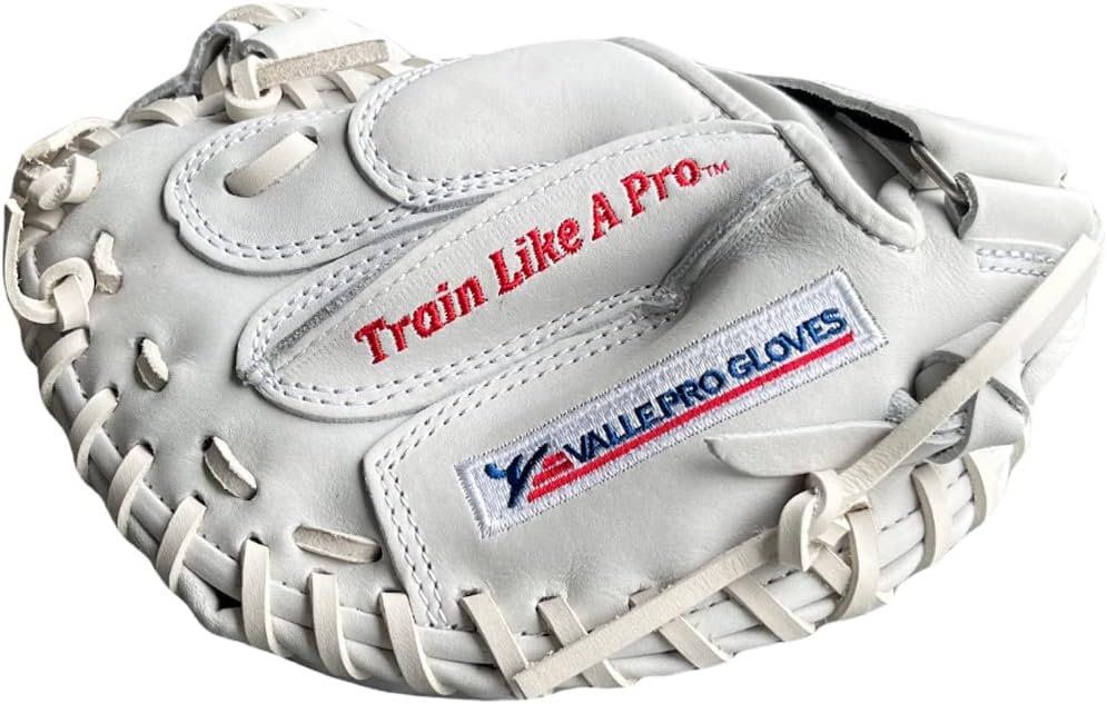 The Valle Eagle 27S Strap-Back Baseball Catcher’s Training Mitt is designed to help catchers master their framing and stick borderline pitches with precision. This 27” mitt, featuring Valle's trademark all-white color, is perfect for bullpen sessions and catcher-specific drills that demand heightened focus. Crafted with high-quality USA Steerhide leather and Major League-quality USA tanned lacing, the Valle Eagle 27S ensures long-lasting durability. Built to handle high-level training drills, it includes additional palm padding for increased impact absorption. Major League organizations trust this mitt to promote good catching habits and use it in all practice scenarios. The one-piece solid web design, smaller pocket size, and adjustable wrist strap encourage proper catching techniques. Elevate your game with this essential baseball and softball training glove. Perfect for fielding, catching, and eye coordination drills, the Valle Eagle 27S is the elite gear you need to take your practice to the next level. Get yours today and improve your catching skills!